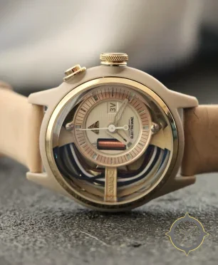 A Skeleton watch with a bold 42mm presence on the wrist, crafted from gold featuring a white dial with a unique vertical ribbed / lightly textured finish.
