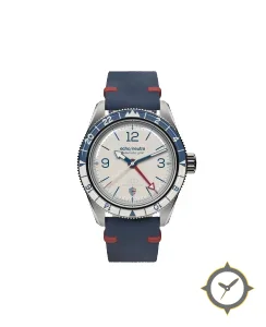 A GMT watch with a vintage-inspired 33.5mm case, crafted from stainless steel featuring a white dial with a unique matte finish and a true GMT complication for tracking a second time zone.