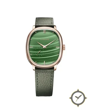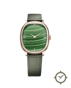A Dress watch with a vintage-inspired 36.5mm case, crafted from gold featuring a green dial with a unique malachite-style textured with horizontal banding finish.