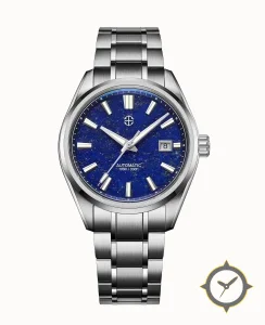 A Sports watch with a vintage-inspired 35mm case, crafted from stainless steel featuring a blue dial with a unique lapis-lazuli (stone) finish.