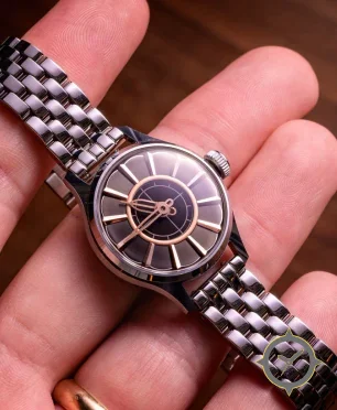 A Skeleton watch with a vintage-inspired 29.5mm case, crafted from stainless steel featuring a black dial with a unique skeletonized / open-work with radial spokes finish.