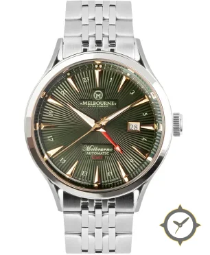 A GMT watch with a bold 43.5mm presence on the wrist, crafted from stainless steel featuring a green dial with a unique sunburst radial guilloché finish and a true GMT complication for tracking a second time zone.