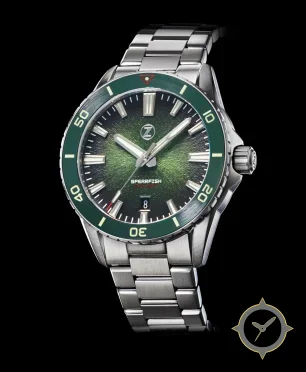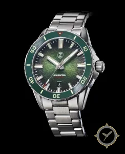 A Dive watch with a vintage-inspired 35mm case, crafted from stainless steel featuring a green dial with a unique sunburst (radial textured) finish.