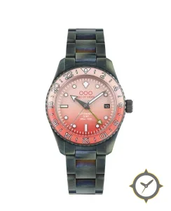 A GMT watch with a bold 46.5mm presence on the wrist, crafted from stainless steel featuring a red dial with a unique textured, slightly granular finish with gradient finish and a true GMT complication for tracking a second time zone.