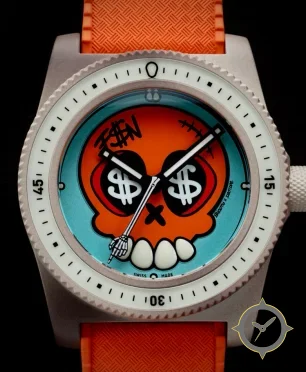 A Dive watch with a bold 48mm presence on the wrist, crafted from stainless steel featuring a orange dial with a unique printed-art finish.