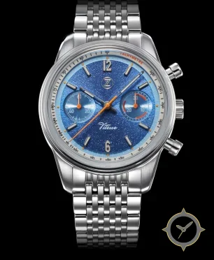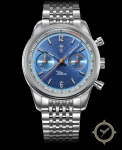 A Chronograph watch with a vintage-inspired 36.5mm case, crafted from stainless steel featuring a blue dial with a unique textured, grainy/sparkling finish finish.