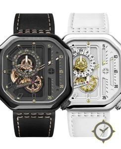 A Skeleton watch with a vintage-inspired 36.5mm case, crafted from stainless steel featuring a black dial with a unique brushed vertical stripes finish.