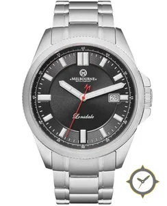 A Sports watch with a vintage-inspired 34mm case, crafted from stainless steel featuring a black dial with a unique matte center with concentric ring texture around chapter ring finish.