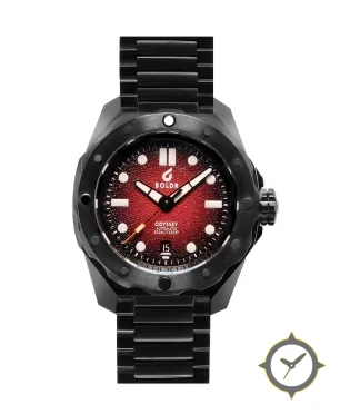A Dive watch with a vintage-inspired 37.5mm case, crafted from stainless steel featuring a red dial with a unique granular / sandpaper texture finish.