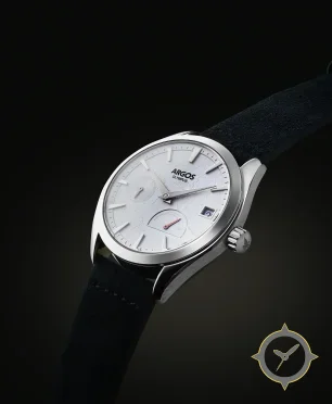A Dress watch with a bold 47.5mm presence on the wrist, crafted from stainless steel featuring a white dial with a unique subtle textured / meteorite-like finish finish.