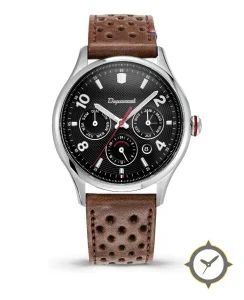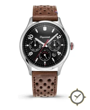 A Racing watch with a bold 43mm presence on the wrist, crafted from stainless steel featuring a black dial with a unique guilloché / concentric circular texture finish and a true GMT complication for tracking a second time zone.
