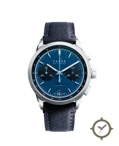 A Chronograph watch with a versatile 39mm case, that suits most wrists, crafted from stainless steel featuring a blue dial with a unique textured crosshatch/guilloché finish.