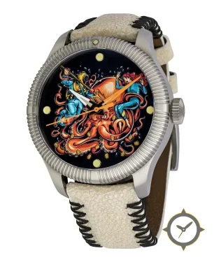 A Dive watch with a bold 50mm presence on the wrist, crafted from stainless steel featuring a black dial with a unique illustrated enamel-style printed artwork finish.