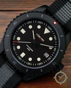 A Dive watch with a vintage-inspired 33mm case, crafted from Coating featuring a black dial with a unique matte finish.