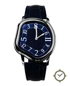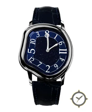 A Luxury watch with a bold 45mm presence on the wrist, crafted from stainless steel featuring a navy dial with a unique starry aventurine-like finish with speckled glitter finish.