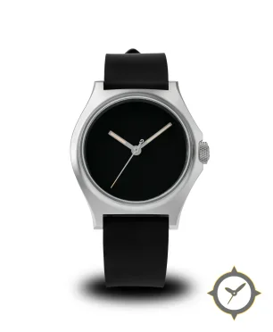 A Minimalist watch with a vintage-inspired 33mm case, crafted from stainless steel featuring a black dial with a unique matte finish.