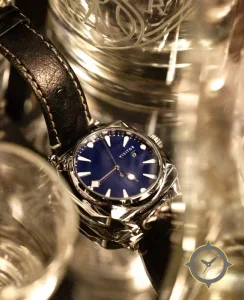A Sports watch with a bold 43mm presence on the wrist, crafted from stainless steel featuring a blue dial with a unique sunburst finish.