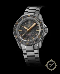 A Dive watch with a vintage-inspired 36.5mm case, crafted from stainless steel featuring a gray dial with a unique marbled/forged-carbon texture finish.