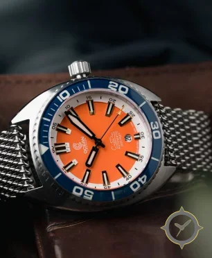 A Dive watch with a bold 52mm presence on the wrist, crafted from stainless steel featuring a orange dial with a unique matte finish.