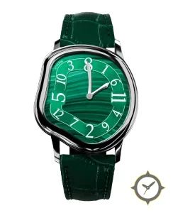 A Luxury watch with a vintage-inspired 33.5mm case, crafted from stainless steel featuring a green dial with a unique malachite/stone-grain finish.