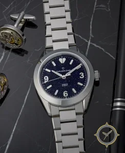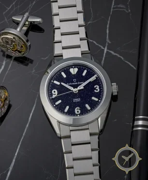 A Sports watch with a vintage-inspired 33.5mm case, crafted from stainless steel featuring a navy dial with a unique aventurine (sparkle / starry) finish.