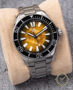 A Dive watch, crafted from stainless steel featuring a gold dial with a unique sunburst gradient with geometric hexagonal guilloché finish.