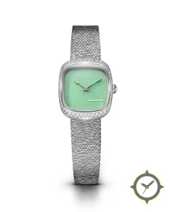 A Dress watch with a vintage-inspired 34.5mm case, crafted from stainless steel featuring a turquoise dial with a unique textured (granular / sandblasted) finish.