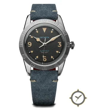 A Vintage watch with a bold 42mm presence on the wrist, crafted from stainless steel featuring a black dial with a unique grained/textured finish.