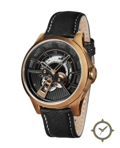 A Skeleton watch with a vintage-inspired 36.5mm case, crafted from gold featuring a black dial with a unique open-worked (skeleton) with radial brushing and vertical ribbing finish.