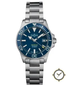A Dive watch with a vintage-inspired 35.5mm case, crafted from stainless steel featuring a blue dial with a unique sunburst finish.