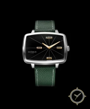 A Dress watch with a vintage-inspired 37.5mm case, crafted from stainless steel featuring a black dial with a unique glossy finish.