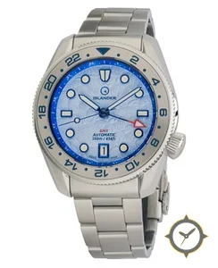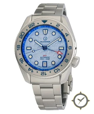 A GMT watch with a bold 45mm presence on the wrist, crafted from stainless steel featuring a blue dial with a unique textured (wave) finish and a true GMT complication for tracking a second time zone.