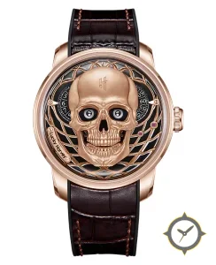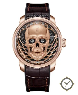 A Skeleton watch with a bold 48mm presence on the wrist, crafted from gold featuring a black dial with a unique 3D sculpted skull centerpiece over an openworked/lattice background finish.