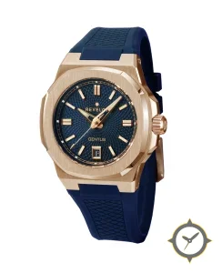 A Luxury watch with a vintage-inspired 36mm case, crafted from gold featuring a navy dial with a unique radial guilloché / hobnail textured finish finish.