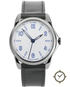 A Dress watch with a bold 46mm presence on the wrist, crafted from stainless steel featuring a white dial with a unique vitreous enamel finish.
