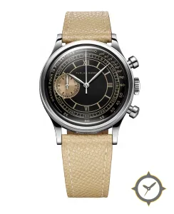 A Chronograph watch with a vintage-inspired 31.5mm case, crafted from stainless steel featuring a black dial with a unique glossy lacquer finish.
