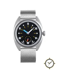 A Minimalist watch with a vintage-inspired 29.5mm case, crafted from stainless steel featuring a black dial with a unique matte finish.