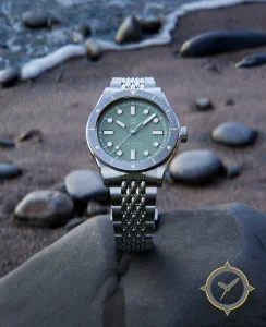 A Dive watch with a bold 42.5mm presence on the wrist, crafted from stainless steel featuring a green dial with a unique waffle / hobnail texture finish.