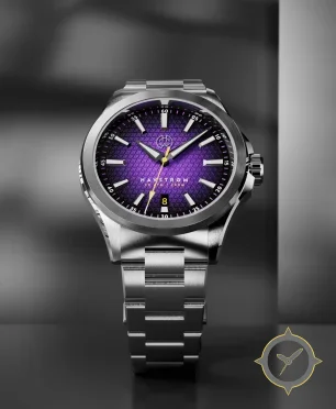 A Sports watch with a vintage-inspired 37mm case, crafted from stainless steel featuring a purple dial with a unique brushed metallic with raised triangular geometric tessellation finish.