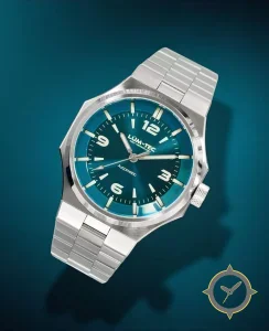A Sports watch with a bold 45.5mm presence on the wrist, crafted from stainless steel featuring a turquoise dial with a unique sunburst / radial finish.