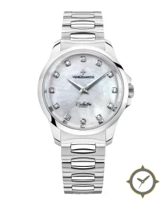 A Luxury watch with a vintage-inspired 37mm case, crafted from stainless steel featuring a white dial with a unique mother-of-pearl finish.