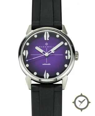 A Vintage watch with a vintage-inspired 30mm case, crafted from stainless steel featuring a purple dial with a unique fumé (gradient) finish.
