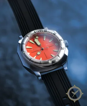 A Dive watch with a bold 49.5mm presence on the wrist, crafted from stainless steel featuring a red dial with a unique sunburst/gradient finish.