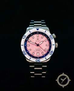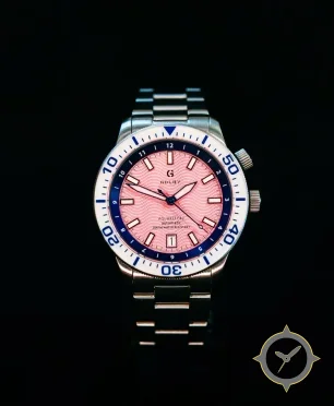 A Dive watch with a bold 45.5mm presence on the wrist, crafted from stainless steel featuring a red dial with a unique wave/guilloché finish.