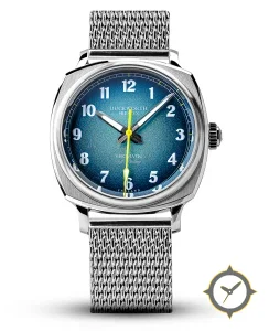 A Field watch with a bold 43.5mm presence on the wrist, crafted from stainless steel featuring a blue dial with a unique grained sunburst finish.