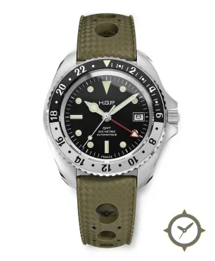 A Dive watch with a bold 50.5mm presence on the wrist, crafted from stainless steel featuring a black dial with a unique matte finish and a true GMT complication for tracking a second time zone.
