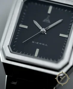 A Luxury watch with a vintage-inspired 34.5mm case, crafted from stainless steel featuring a black dial with a unique matte finish.
