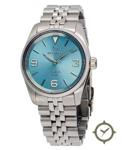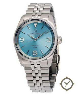 A Dress watch with a versatile 38mm case, that suits most wrists, crafted from stainless steel featuring a turquoise dial with a unique sunburst (radial) finish.