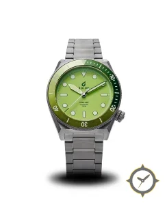 A Dive watch with a vintage-inspired 33mm case, crafted from titanium featuring a green dial with a unique matte finish.