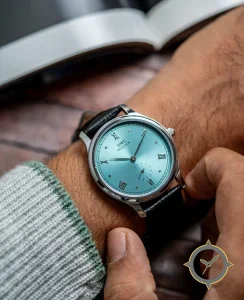 A Dress watch with a vintage-inspired 33mm case, crafted from stainless steel featuring a turquoise dial with a unique sunburst (radial) finish.